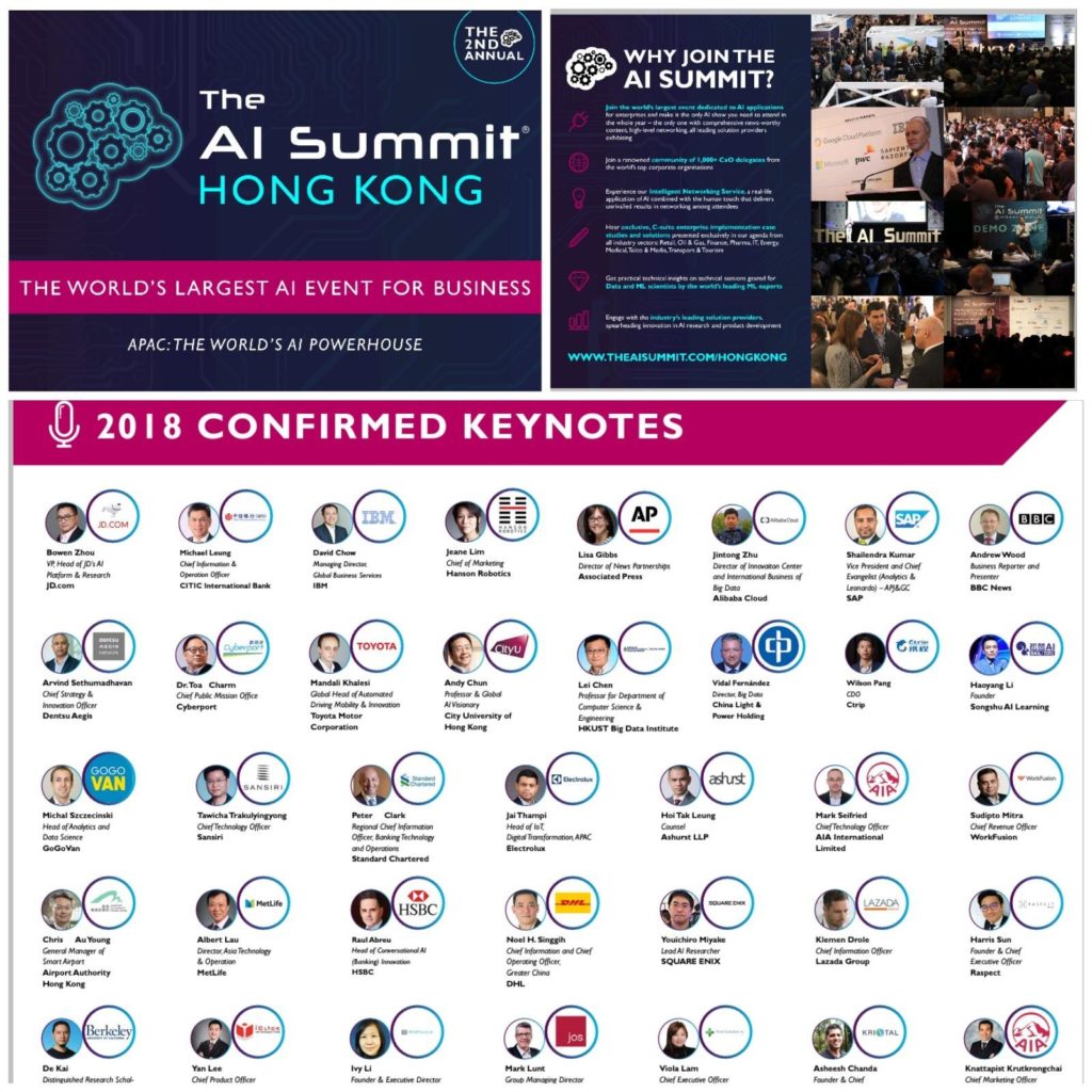 AISummit AI Cyberport The Global AI Summit is back to Hong Kong 2nd year in a row. The one in 2017 went extremely well with many leading AI innovators, enterprises and start-ups. It will be held on Aug 1 in Grand Hyatt Hong Kong. The same summit is run every year in San Franciso, New York, London and more.